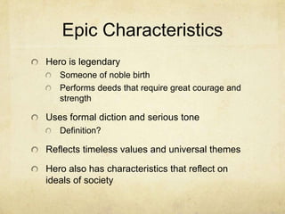 The values of the culture are reflected in the stories events. Which characteristics is not true of epics. The setting is grand in scope covering nations the world or.